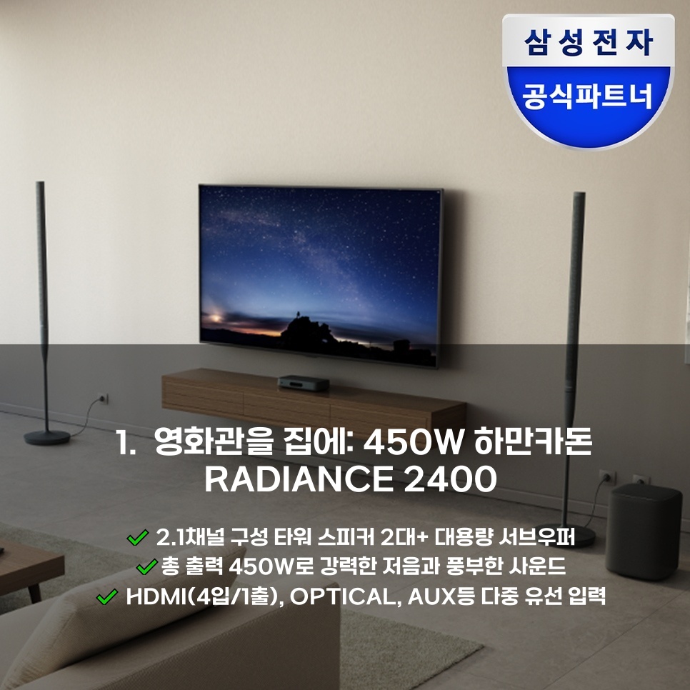삼성전자 하만카돈 RADIANCE 2400 리뷰 집에서 콘서트홀 같은 사운드 경험네이버 체험단에 오신 여러분, 안녕하세요!오늘은 삼성전자의 하만카돈 RADIANCE 2400 홈시어터 사운드바 시스템 HKRADIANCE24BLKAS를 한 번 살펴보겠습니다.궁금하신 점이 있으면 댓글이나 문의글로 알려주세요~제품 개요와 주요 스펙삼성전자 하만카돈 RADIANCE 2400 홈시어터 사운드바 시스템(HKRADIANCE24BLKAS)은 2.1채널 구성으로 타워 스피커 2대와 대용량 서브우퍼를 포함한 패키지 제품이며, 총 출력은 450W로 강력한 저음과 풍성한 사운드를 제공해요. 다양한 입력 단자(HDMI 4입/1출, OPTICAL, AUX)와 Wi‑Fi, 블루투스, AirPlay2, 크롬캐스트 등의 무선 연결을 ..